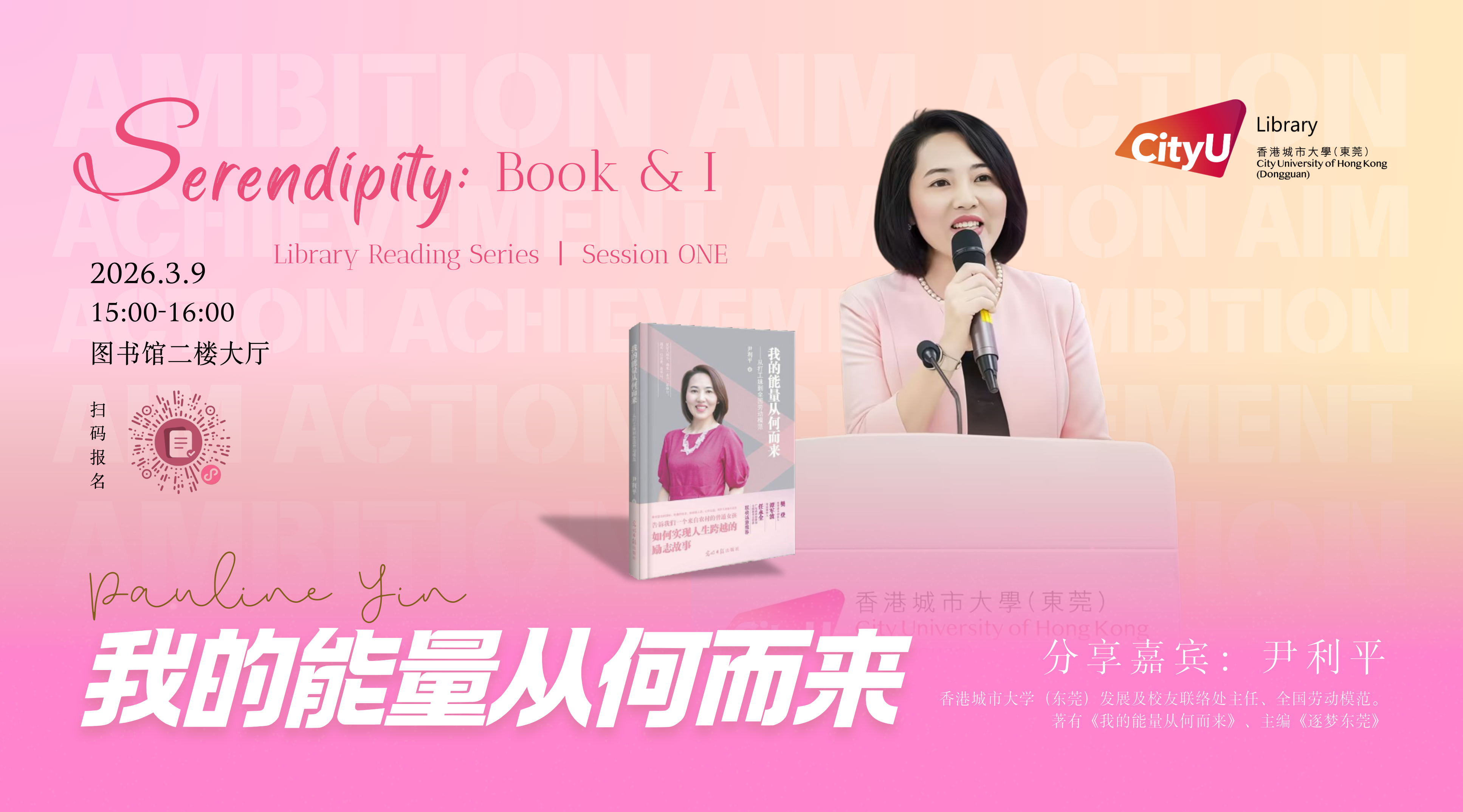 各位读者:阳春三月,恰逢国际妇女节。本次活动作为“书与我,恰好相逢”读书分享系列活动的第1期,香港城市大学东莞(图书馆)特邀发展与校友联络处尹利平主任担任分享嘉宾,以图书作者身份,结合自身著作与成长经历,分享人生感悟与奋斗智慧,传递温暖而有力量的女性成长力量。活动现场还将提供精美茶歇,在书香与温馨氛围中,以茶会友,与各位师生共赴阅读与成长的美好相遇! 本期嘉宾:尹利平(Pauline Yin…